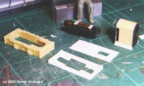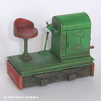 Simon tells us: "I first became aware of this little loco from a posting Gnatterbox by Paul Napier. An order for components from Steve Bennett resulted in additional information and pictures. Recently David Colley has also provided information about the loco's controls. The Mite underframe was modified to accept a cut down Kato chassis. A deck sub-assembly was made out of plasticard sheet, aud U and Z channel to cover the top of the chassis. The dead space in the underframe and sub-assembly was filled with lead sheet, keeping the centre of gravity low. The Wasp bonnet was shortened, given ends out of plasticard and the grill holes drilled. The loco was then detailed with Sidelines castings. Couplings and further detailing will be applied in the near future.."  |